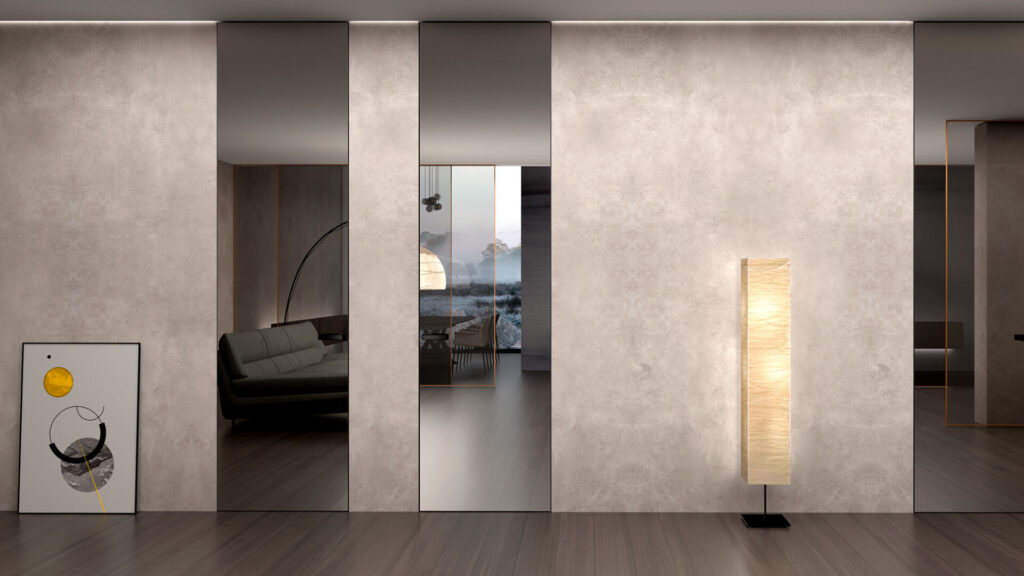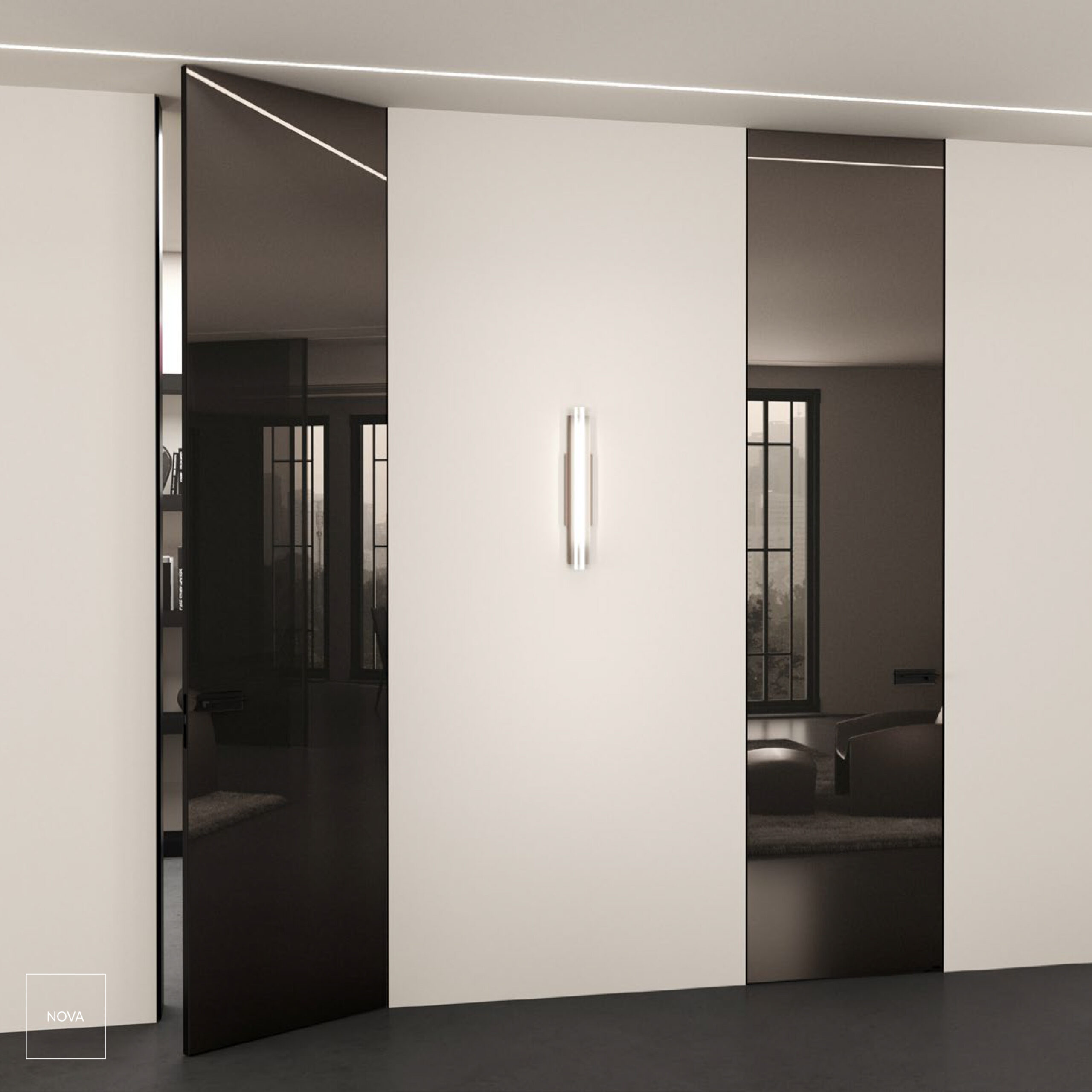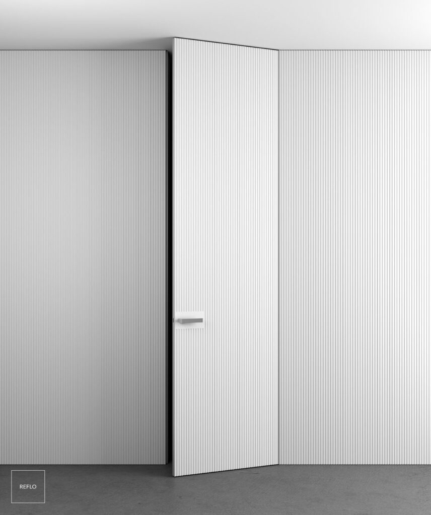 Türen in Paneelwänden oder als vollflächiger Spiegel: Reverse Innentüren gliedern sich mit 100% Bündigkeit und nahezu unsichtbar in Ihre Wandelemente ein. Für Raumgefüge der Extraklasse.